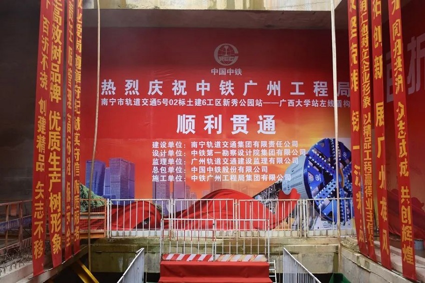 6月2日,南寧地鐵5號線新秀公園站—廣西大學(xué)站區(qū)間(以下簡稱“新廣區(qū)間”)中鐵裝備110號盾構(gòu)機(jī)安全到達(dá)鋼套筒內(nèi),實(shí)現(xiàn)雙線貫通!圓滿完成國內(nèi)首例大角度小半徑穿越富水圓礫地層運(yùn)營線任務(wù)!為南寧地鐵5號線全線隧道貫通奠定了堅(jiān)實(shí)基礎(chǔ),打響了“抗疫情,保增長,大干100天”專項(xiàng)勞動競賽第一炮!