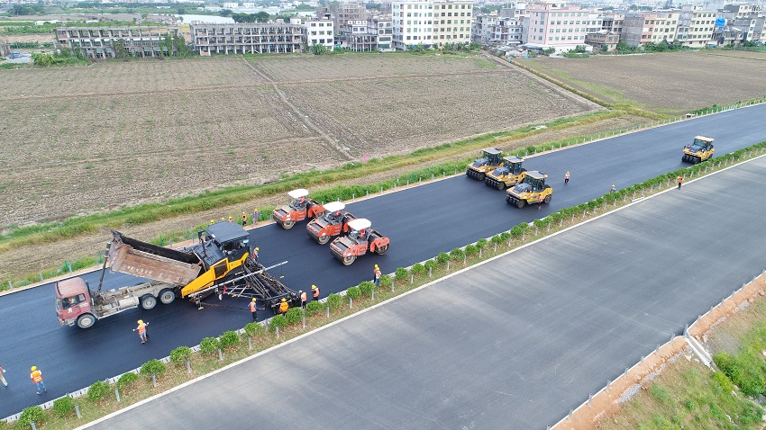7月8日,汕揭項(xiàng)目第二作業(yè)面K27+750-K28+050段瀝青路面上面層試驗(yàn)段鋪設(shè)順利完成。