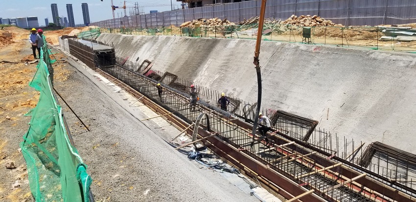 7月26日,旱塘主變電纜廊道現(xiàn)場呈現(xiàn)出熱火朝天的大干場面。指揮部指導工區(qū)加大資源投入,精心組織施工,拉開了旱塘主變電纜廊道全面施工的序幕。旱塘主變電纜廊道總長1791.59m,包括頂管段和明挖段,其中頂管施工383.5m,明挖施工1408.09m。截至目前頂管段:1號接收井設計10.735m,累計開挖2.0m;2號始發(fā)接收井設計16.924m,累計開挖8.3m;3號井設計25.461m,累計開挖11.5m;4號井設計12.535m,已完成開挖;明挖段溝槽累計開挖120m,底板混凝土澆筑累計完成110m,頂板混凝土澆筑累計完成60m。