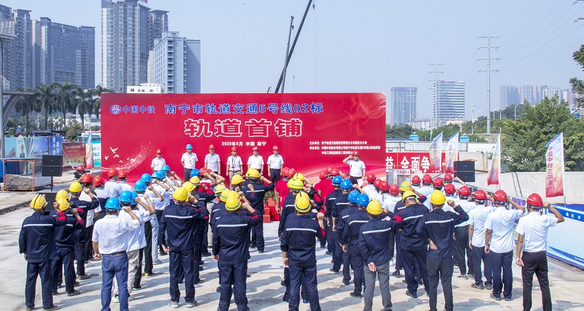9月1日10時(shí)10分,在南寧地鐵5號(hào)線02標(biāo)工程機(jī)電9工區(qū)金橋客運(yùn)站鋪軌基地,軌道首鋪儀式現(xiàn)場(chǎng)彩旗飄揚(yáng),隨著“開始鋪軌”一聲令下,一節(jié)25m軌排被龍門吊穩(wěn)穩(wěn)吊起,緩緩下降安放至隧道內(nèi),標(biāo)志著南寧地鐵5號(hào)線02標(biāo)工程正式進(jìn)入鋪軌大干熱潮。