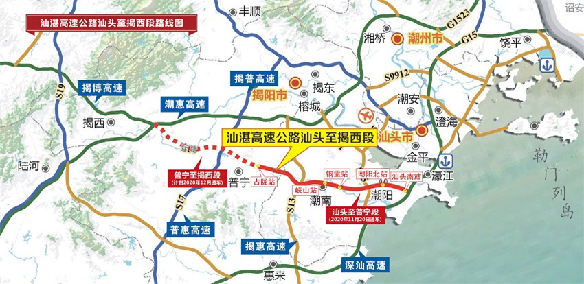 項目由中鐵交通汕湛公司負責建設運營管理,采用高速公路建設標準,設計行車速度120公里/小時,雙向六車道,路基寬度34.5米,路線橫貫汕頭揭陽兩市、直通珠三角,項目建成后成為快速聯通粵東地區與粵港澳大灣區、貫通沿海經濟帶的大動脈,將進一步完善以汕頭為中心的粵東高速公路網絡,縮短粵東與大灣區的時空距離,輕松實現汕潮揭“半小時通勤圈”,汕頭往返普寧行車時間可節約半小時左右,對促進沿線地方經濟發展、方便沿線百姓出行具有重要意義。