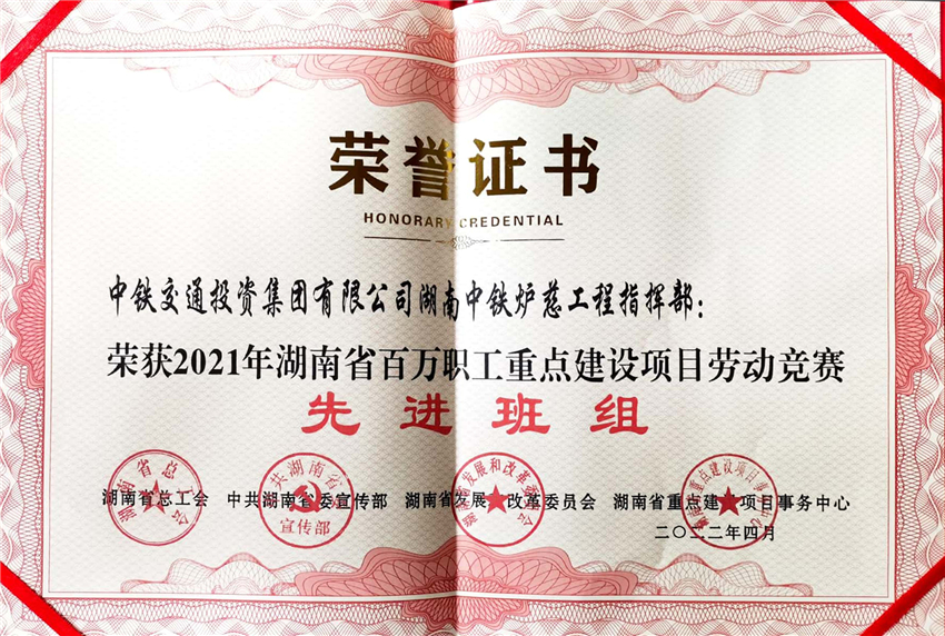 4月29日上午9時,湖南省慶祝“五一”國際勞動節暨先進集體先進個人表彰大會在長沙召開。爐慈桑龍項目共摘得5項“助力十四五 建設新高地”湖南省百萬職工重點建設項目勞動競賽榮譽:爐慈指揮部、桑龍TJ5標項目部榮獲先進班組稱號,項目公司陶新華、劉芳和爐慈TJ1標項目部董李軍榮獲先進個人稱號。